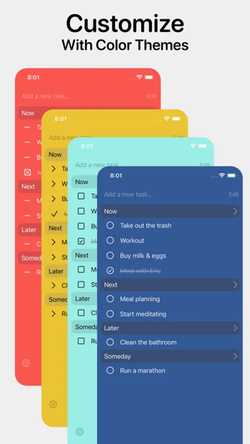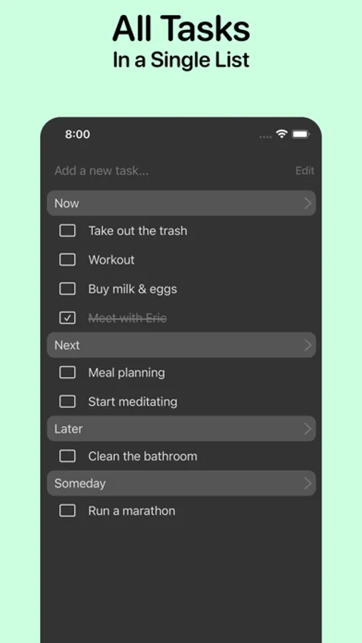 Stop wasting time with complicated apps. Keep it simple with Do Next and actually get things done. One list and four basic categories (Now, Next, Later, Someday) is all you need. Prioritize your tasks and mark them complete... that's it.