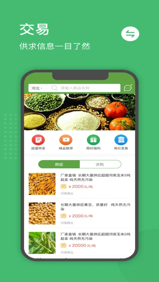 粮食商行APP致力于农产品交易和信息化服务,促进买卖双方高效、安全对接。用户可随时发布农产品采购、供应信息,轻松买货、卖货;可通过粮食商行大数据定制农产品行情信息,实时掌控市场走势,切实有效实现农产品买卖无忧。