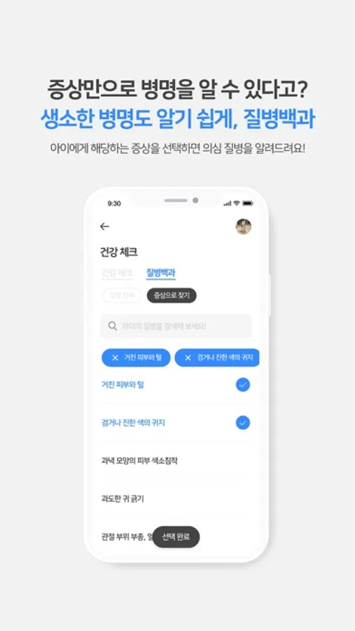 질병백과 내 간단한 증상 체크를 통해 "예상 질병 리스트"를 알려드립니다.