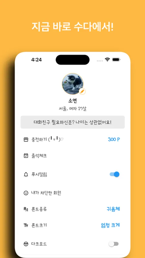 수다는 익명 채팅 서비스로, 복잡한 가입절차가 필요 없어요.