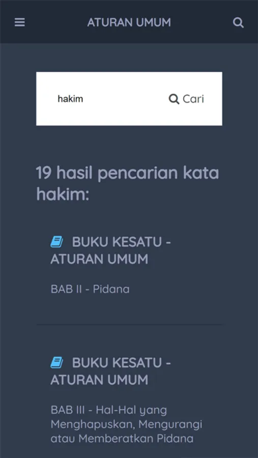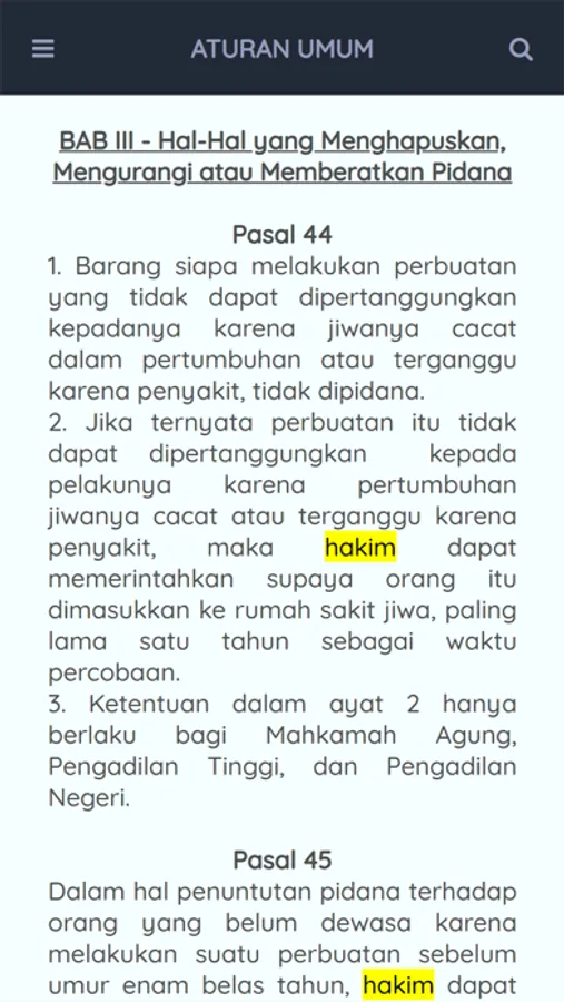 Tampilan app menarik sekali lho, sleek, modern, minimalis dan fungsi-fungsinya sudah cukup banget, kamu bisa membaca pasal demi pasal yang semuanya terkategorikan dengan rapih, ada mesin pencarian yang cakep juga tinggal ketik kata yang mau kamu cari, klik cari, dalam beberapa saat kamu akan melihat hasil pencariannya.