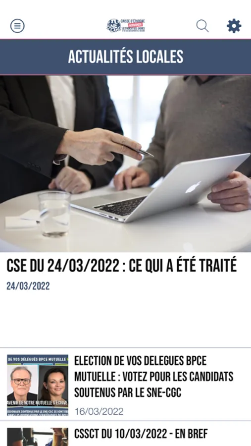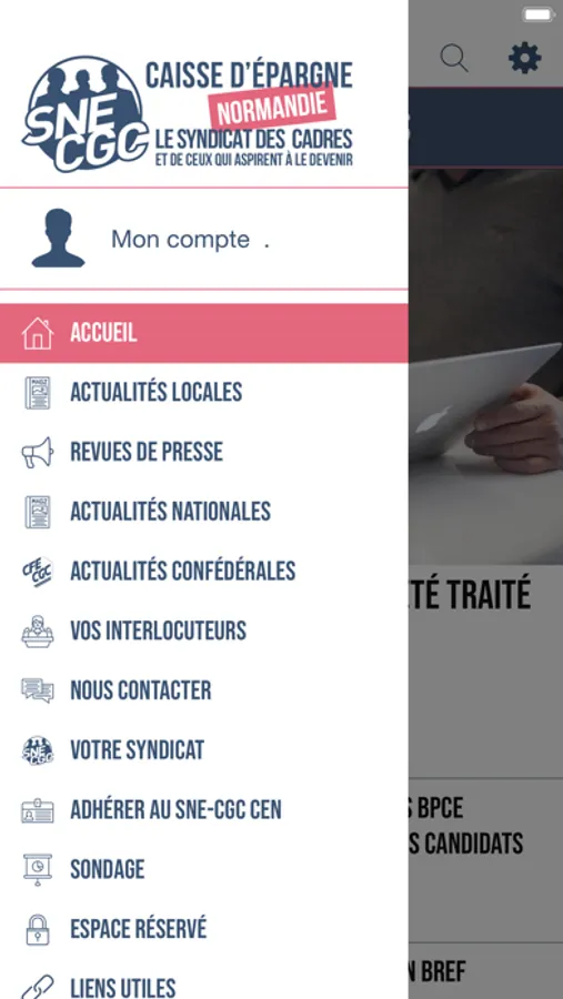 Dans cette application, retrouvez facilement toute l’actualité, nos tracts et toutes les informations liées au dialogue social au sein de la Caisse d’Epargne Normandie et du groupe Caisse d’Epargne.
