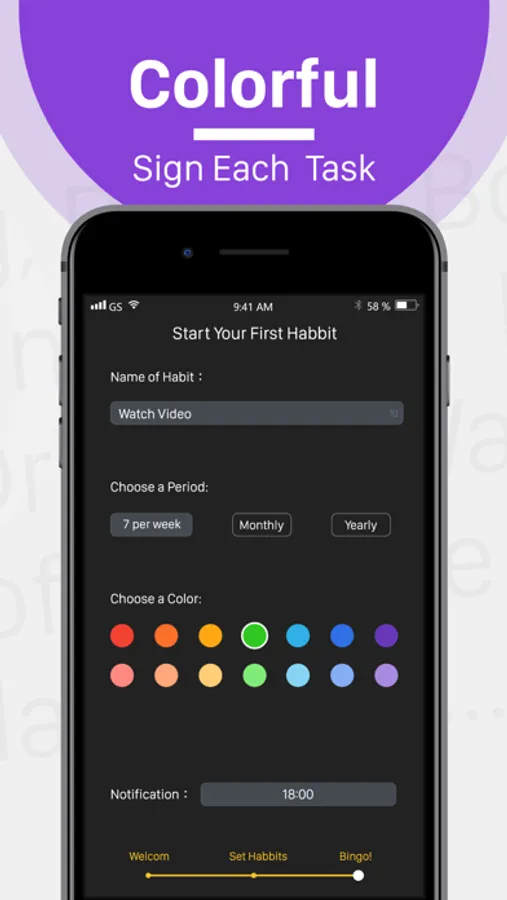 Add a habit: Add a habit that you can customize to name or click on the icon of the custom library to name, set the number of times you want to complete weekly or monthly or daily, and set the color of the task and the time of the daily reminder.
