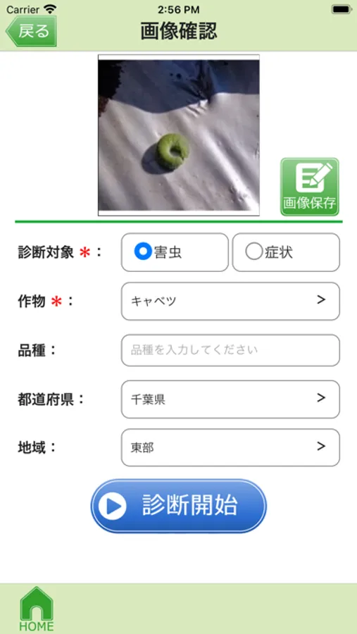 圃場で発生した病害虫をスマートフォンで撮影する、もしくは保存済みの病害虫画像を選択すると、AIが病害虫の種類を判定します。判定率の高い順に診断結果を表示します。