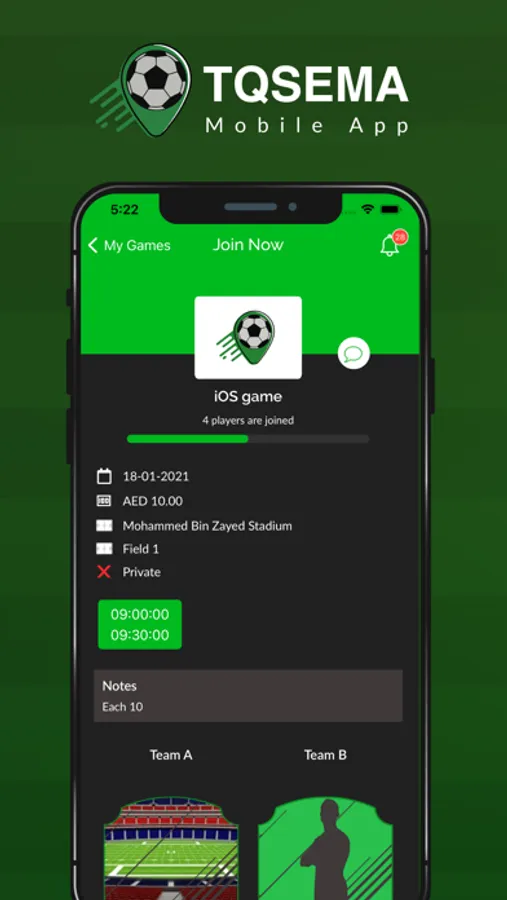 Tqsema App is for reserving football stadiums, the best application that provides players to reserve the right pitch for a distinctive football. It gives stadium owners the ability to add their stadiums and market them through a special space to display the stadiums they own and add specifications for each stadium and a lot of great features.