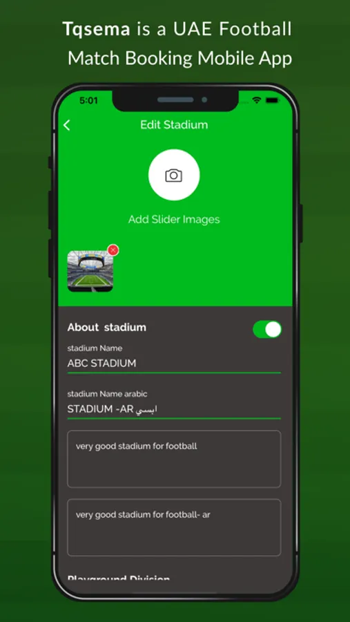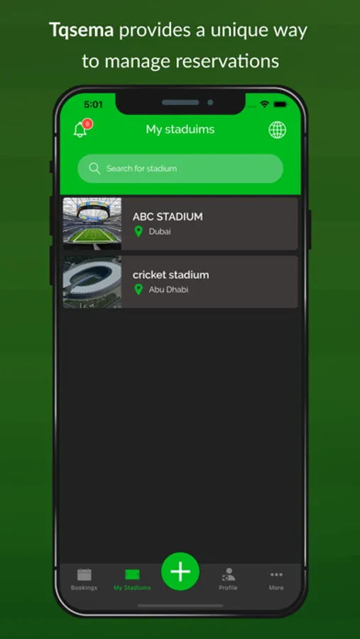 Tqsema App gives stadium owners a unique experience to present their stadiums to the players who wishes to reserve a suitable stadium. The application gives the owners a special space to display their owned stadiums and can add specifications of each stadium and a lot of wonderful features.