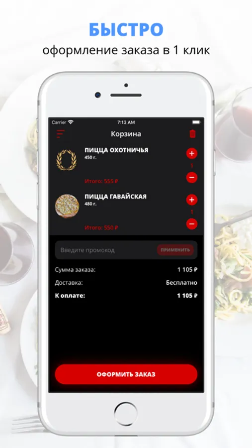 Скачивайте наше приложение, оформляйте заказ и наслаждайтесь любимой едой, где бы Вы ни были! Приятного аппетита!