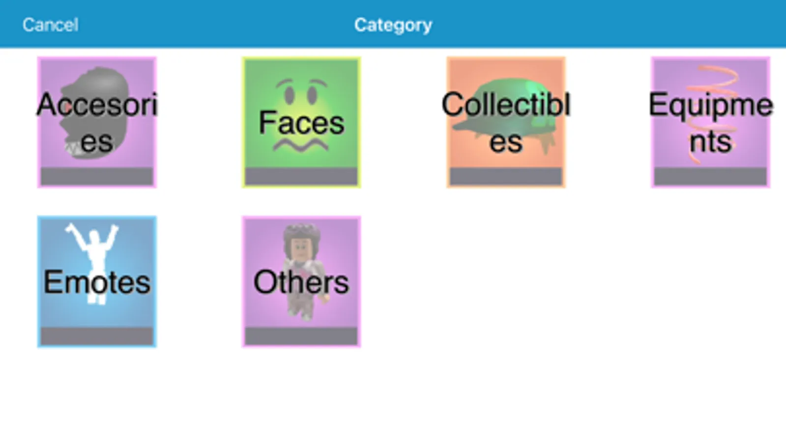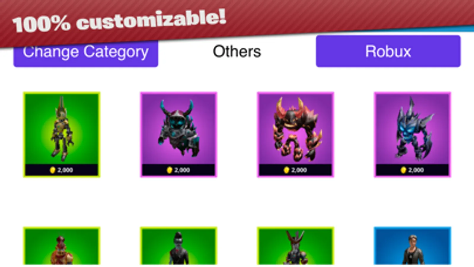 All kinds of objects are available: heads, accessories, collectibles, equipment, etc.