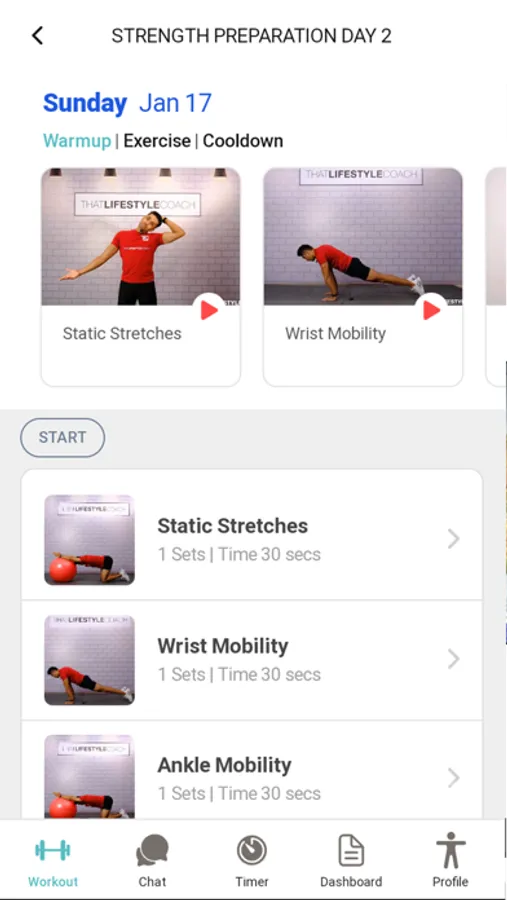 ● Every workout session contains a Warmup, Exercise and Cooldown routine.
