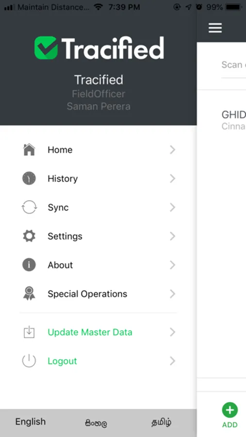 Tracified is a block-chain based traceability solution that connects an entire supplier chain of a product. Tracified Field Officer App is used to enter stage data for all the stages in which a product goes through. Accounts for the field officers are created using the tracified admin portal. Using the created account's email and password Field officer can log in to this application. A transaction account is created for each officer account to connect the officer application with the blockchain gateway. When performing actions, You will be prompted to provide the transaction account's password. (Once you provide this password, you will not be asked to provide this again for the next 4 hours but, if you close the app or log out from the app, you will be asked again to provide this password when operating) A user can install, sign in, manage identifiers, add data for items, transfer item stage, split items, merge items, change user details, reset passwords, and permissions. Field Officers can map out farm boundaries or plot boundaries using geo markers. Users can use this option to subdivide a mapped plot by following the same process.