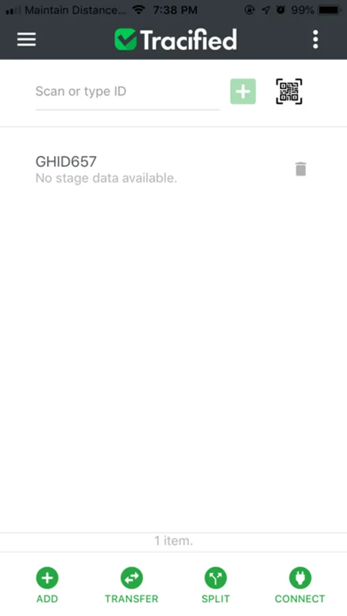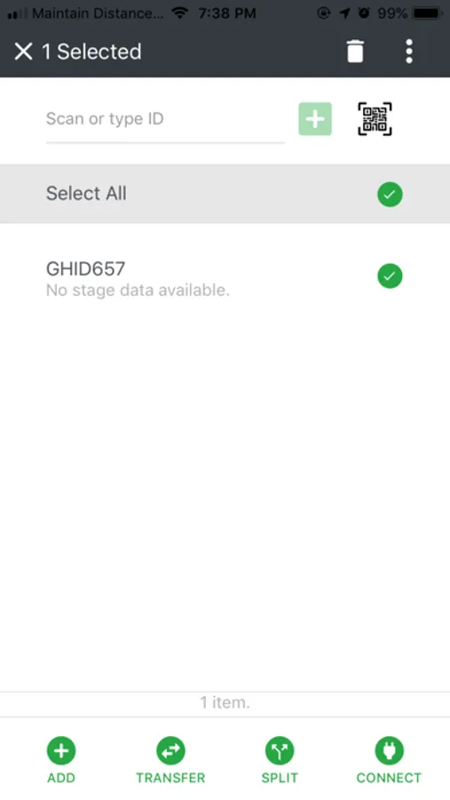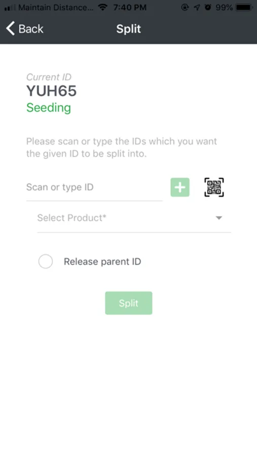 - Split Items: You can add any number of identifiers which you would like to split into by typing or scanning the barcodes. (These identifiers should be new and therefore cannot contain any data) You can also split it into just one identifier.