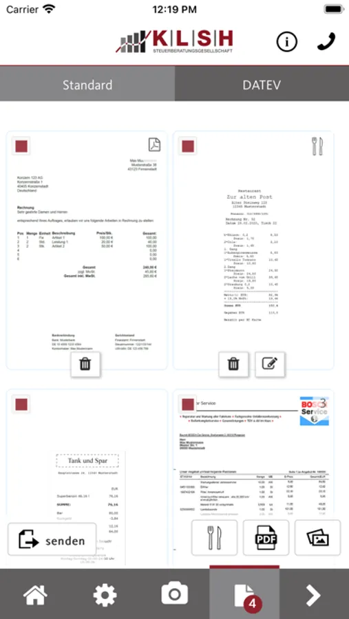 Machen Sie einfach ein oder mehrere Fotos von Ihren Belegen und versenden diese mit einem Klick direkt aus der App heraus an KLSH.