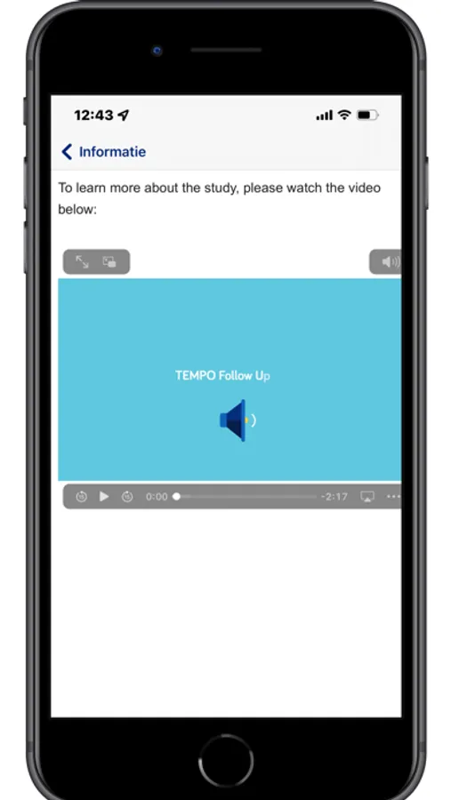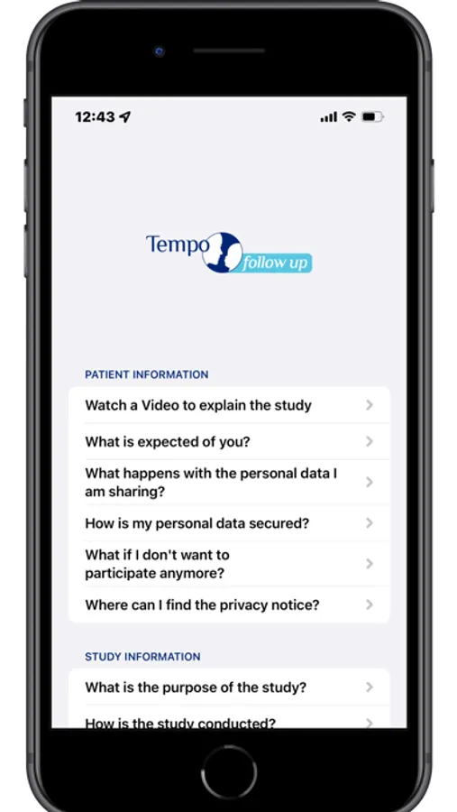 The Tempo Follow Up app is available for participants of the Tempo Follow Up study of Nutricia Research B.V.. Participants must have participated in the TEMPO study of Nutricia Research before. By using the Tempo Follow Up app, participants of the Tempo Follow Up study will be able to digitally complete questionnaires and to read useful information regarding the app.