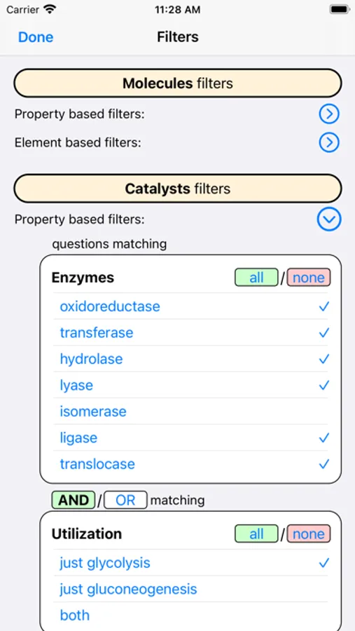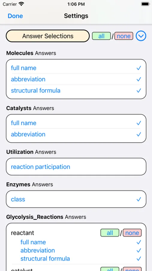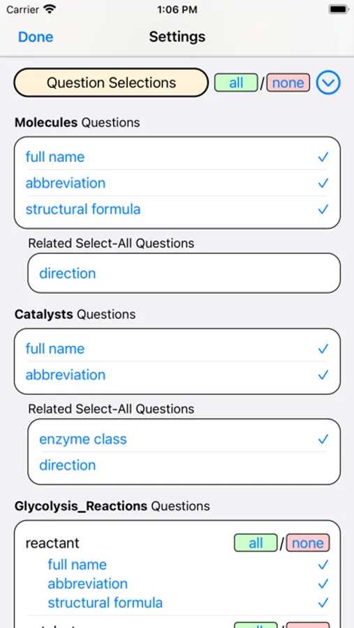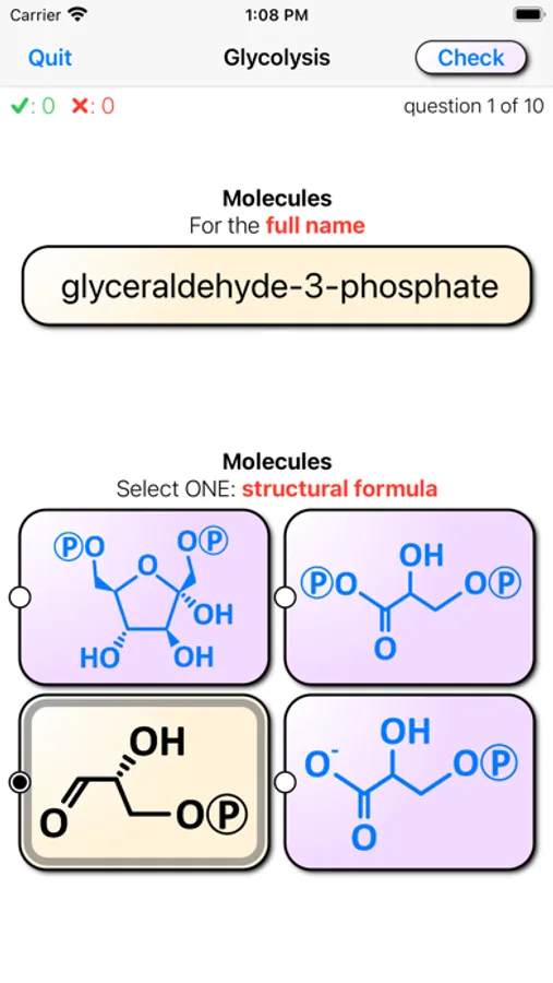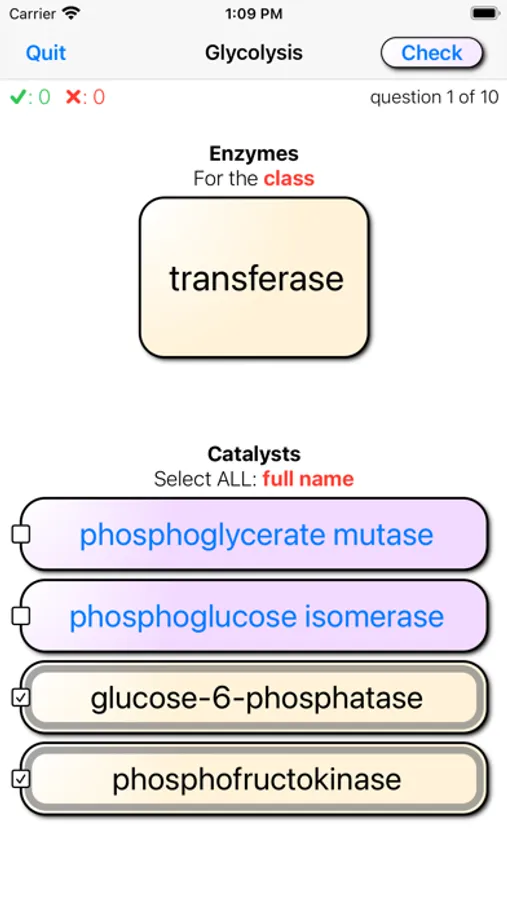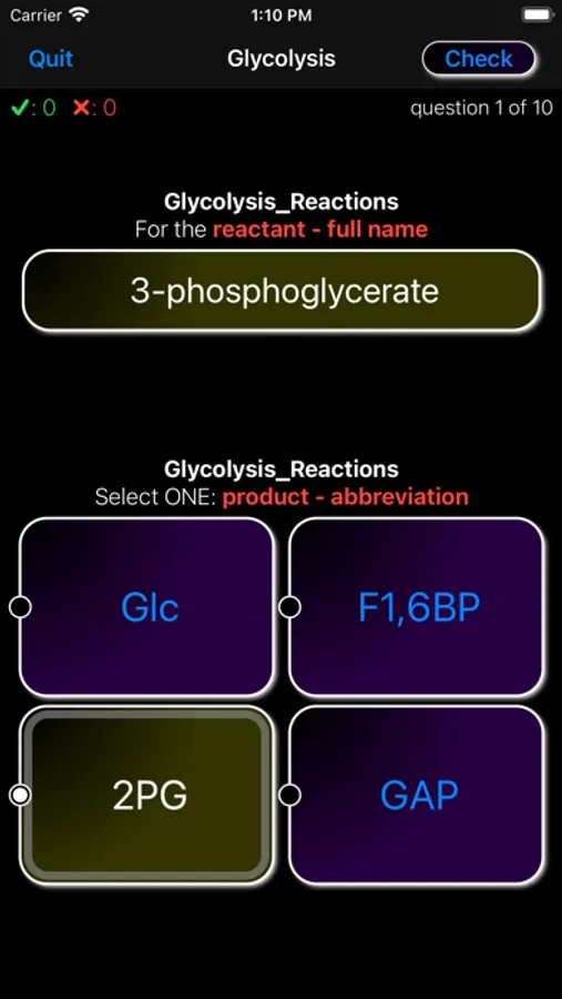 All of this allows you to configure the app to help you quickly learn the glycolysis and gluconeogenesis reactions including the reactants, catalysts, products, co-reactants, and by-products. It is an ideal study aid for biology and biochemistry students who need to memorize various portions of this information.