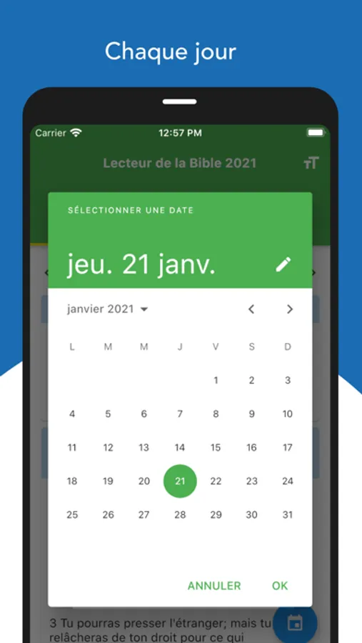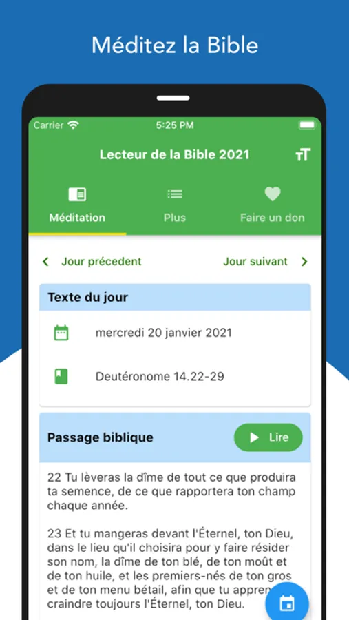 Lecteur de la Bible 2021 est un guide de méditation complet produit par la Ligue pour la Lecture de la Bible (LLB). Il vous permet de lire la Bible chaque jour. Le Lecteur de la Bible 2021 vous propose des commentaires bibliques plus élaborés et des textes bibliques édifiants.