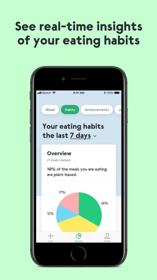 As you track your meals you will be able to see an analysis of your eating habits. It will show you how much of your diet is plant-based, eggs/dairy, fish, or meat. You will be able to see an overview, in detail by meal, and your trend over time. You can also see your achievements – how many plant-based meals you had in total and how many times you’ve reached your plant-based goal.