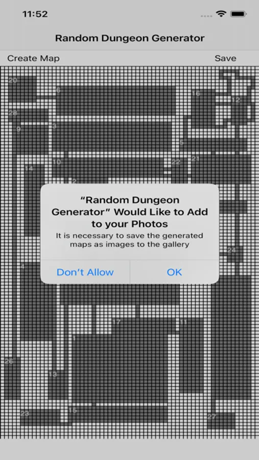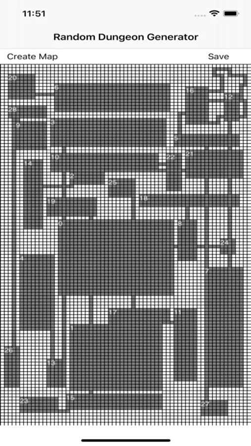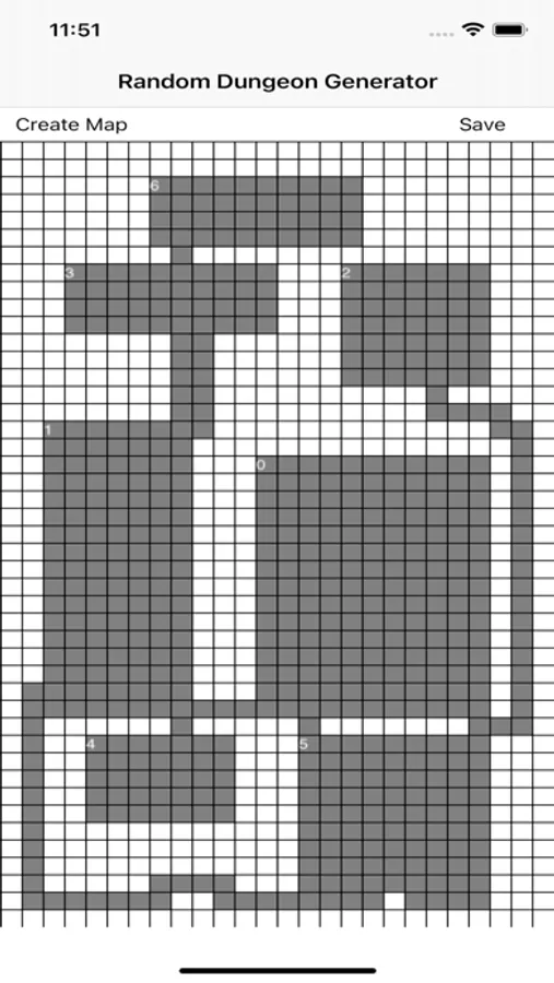 This app creates random map layouts. It is meant to be as simple and lightweight as possible and mostly have connected rooms. Just tap Create Map to make a new one. Click Save to export a map to the camera roll on a device. Nice and easy.