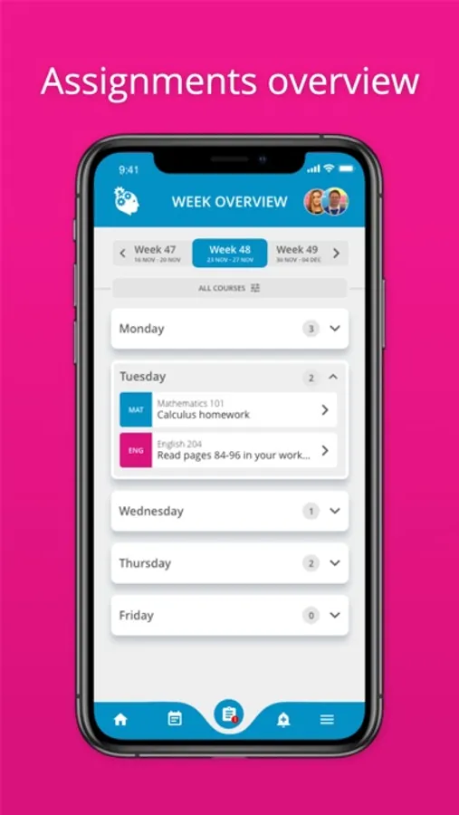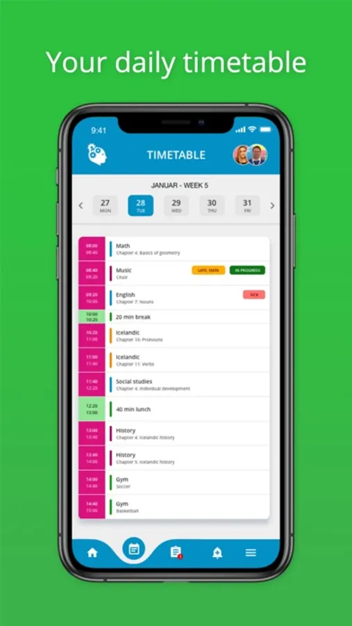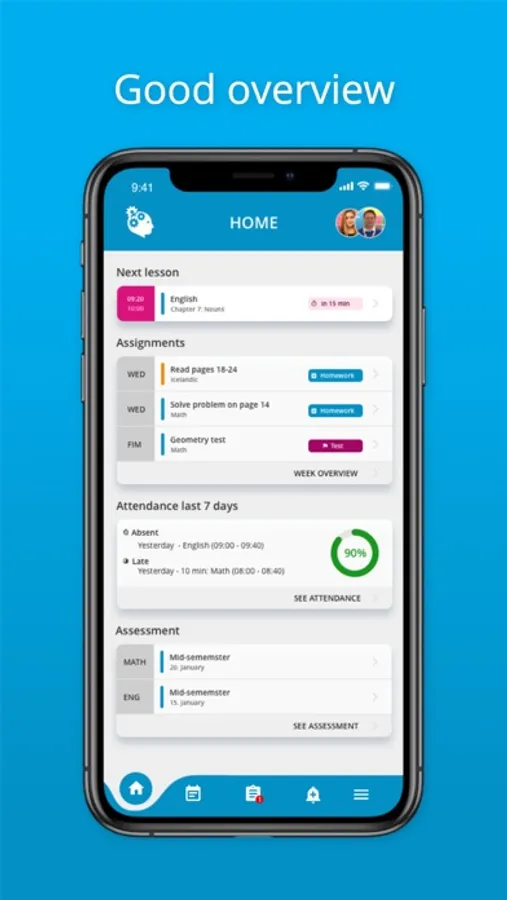 See a good overview of your school information, ongoing and next lesson, assignments, timetable, attendance, assessment and more.