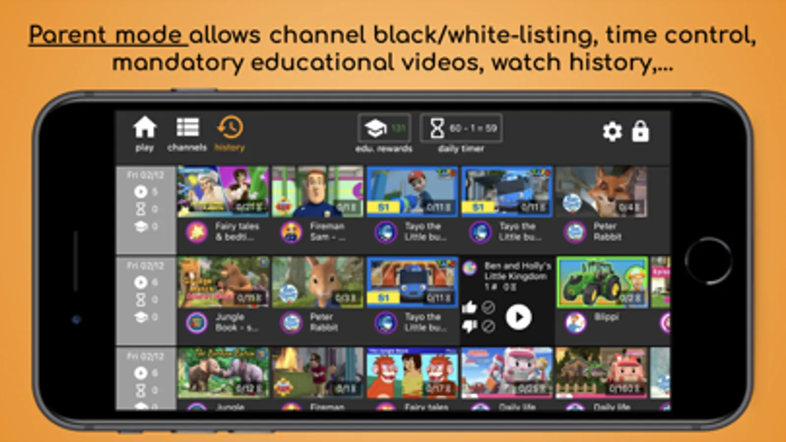 Parents can use watch history to review, for each day, the cumulated watch time and number of videos watched by the child. Parents can also identify channels to BLACKLIST (so child can’t watch anymore).