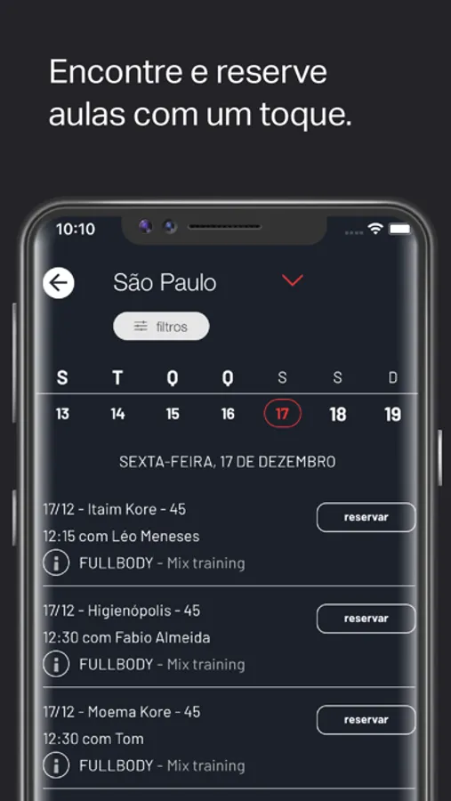 + Filtre aulas pelos studios e faixas horárias que você prefere, para reservar mais rápido
