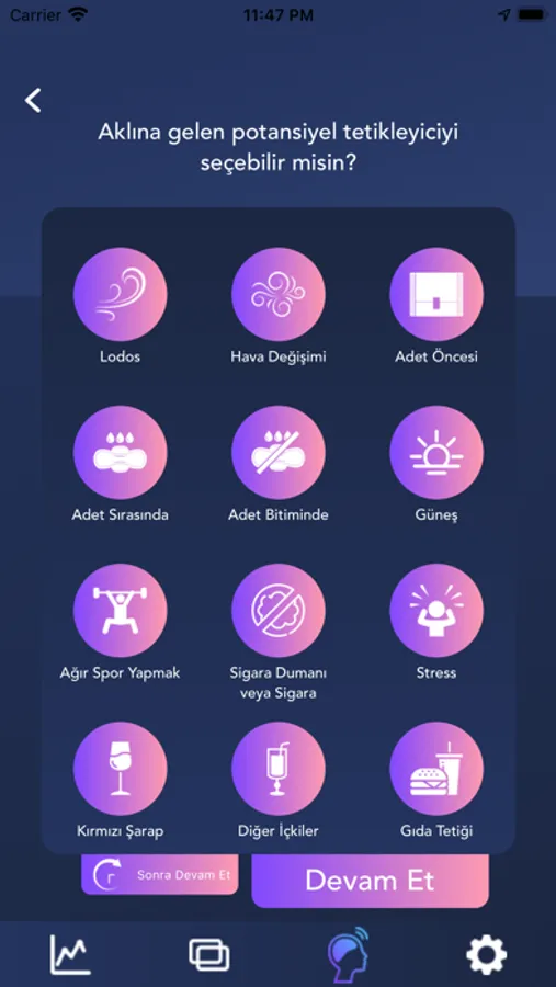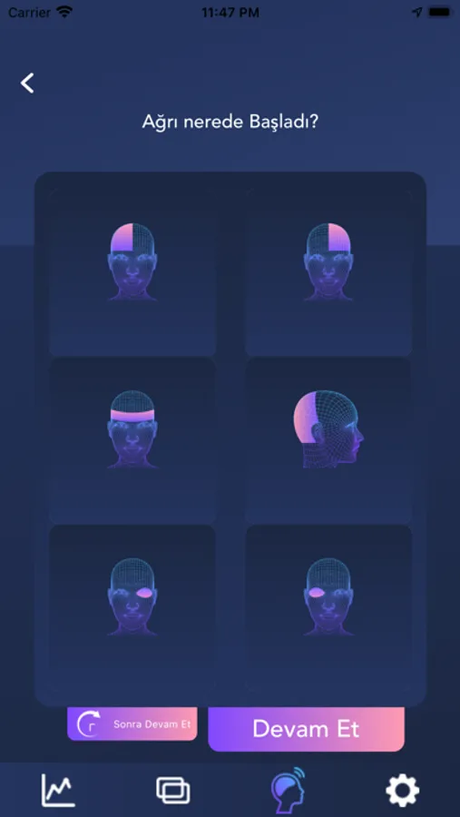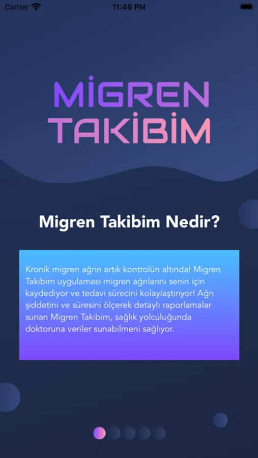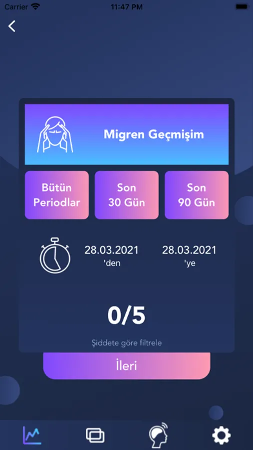 Kronik migren ağrın artık kontrolün altında! Migren Takibim uygulaması migren ağrılarını senin için kaydediyor ve tedavi sürecini kolaylaştırıyor! Ağrı şiddetini ve süresini ölçerek detaylı raporlamalar sunan Migren Takibim, sağlık yolculuğunda doktoruna veriler sunabilmeni sağlıyor.