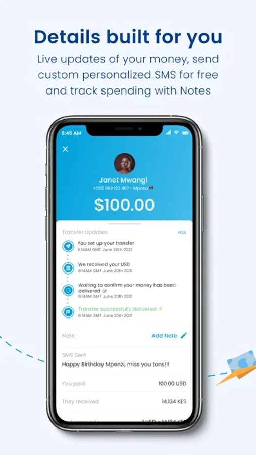 Transparency throughout - We'll share real-time updates so you know your money has arrived safely with a detailed view of where your money is each step of the way.