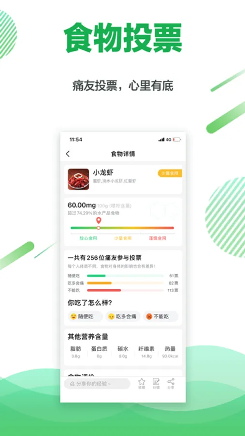 嘌呤摄入量是影响人体尿酸水平的重要因素。通过嘌呤查询功能,帮助高尿酸病友鉴别食物能不能吃。