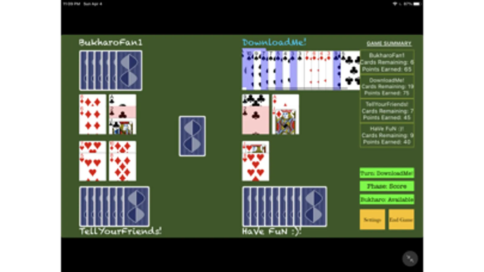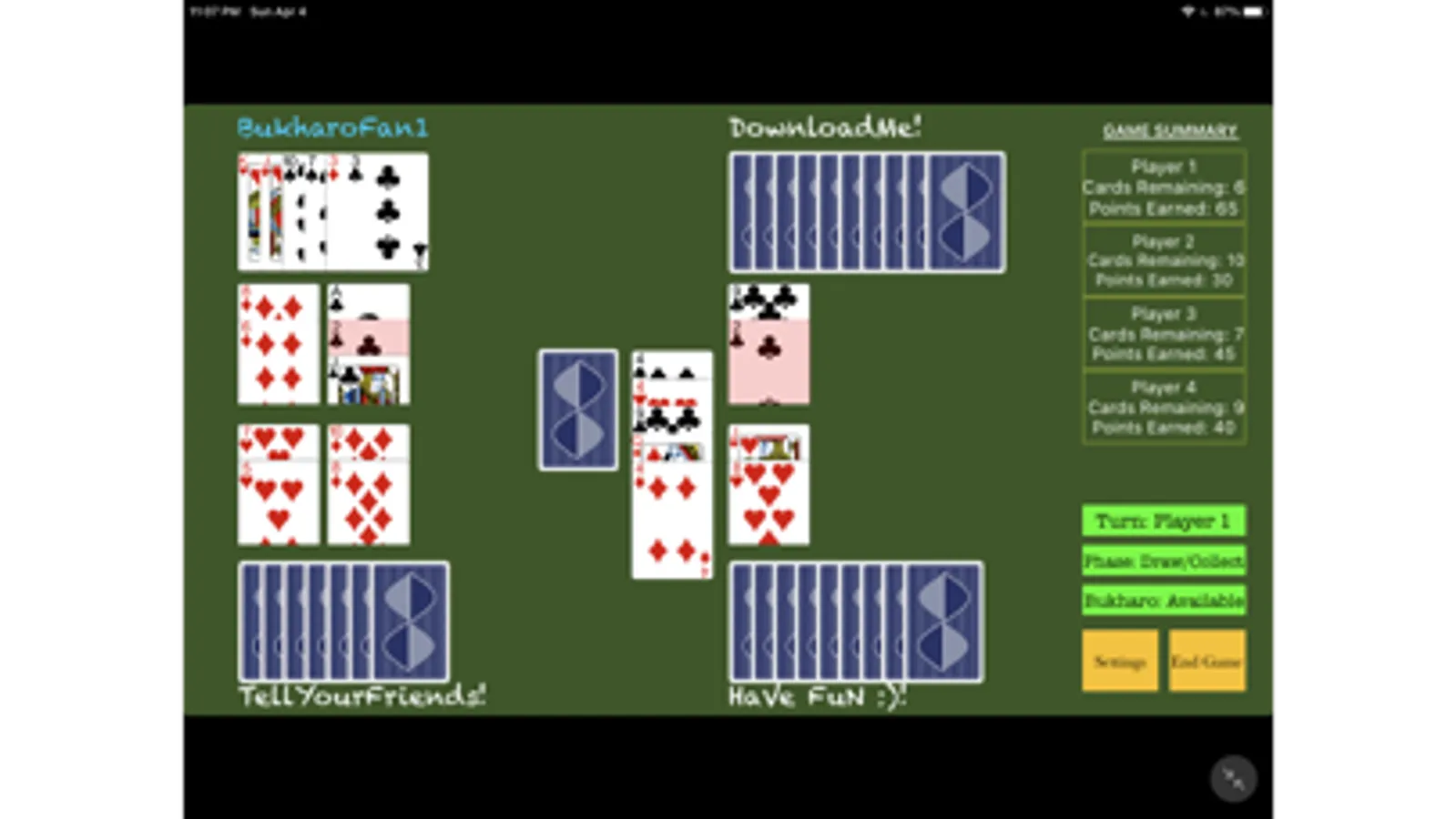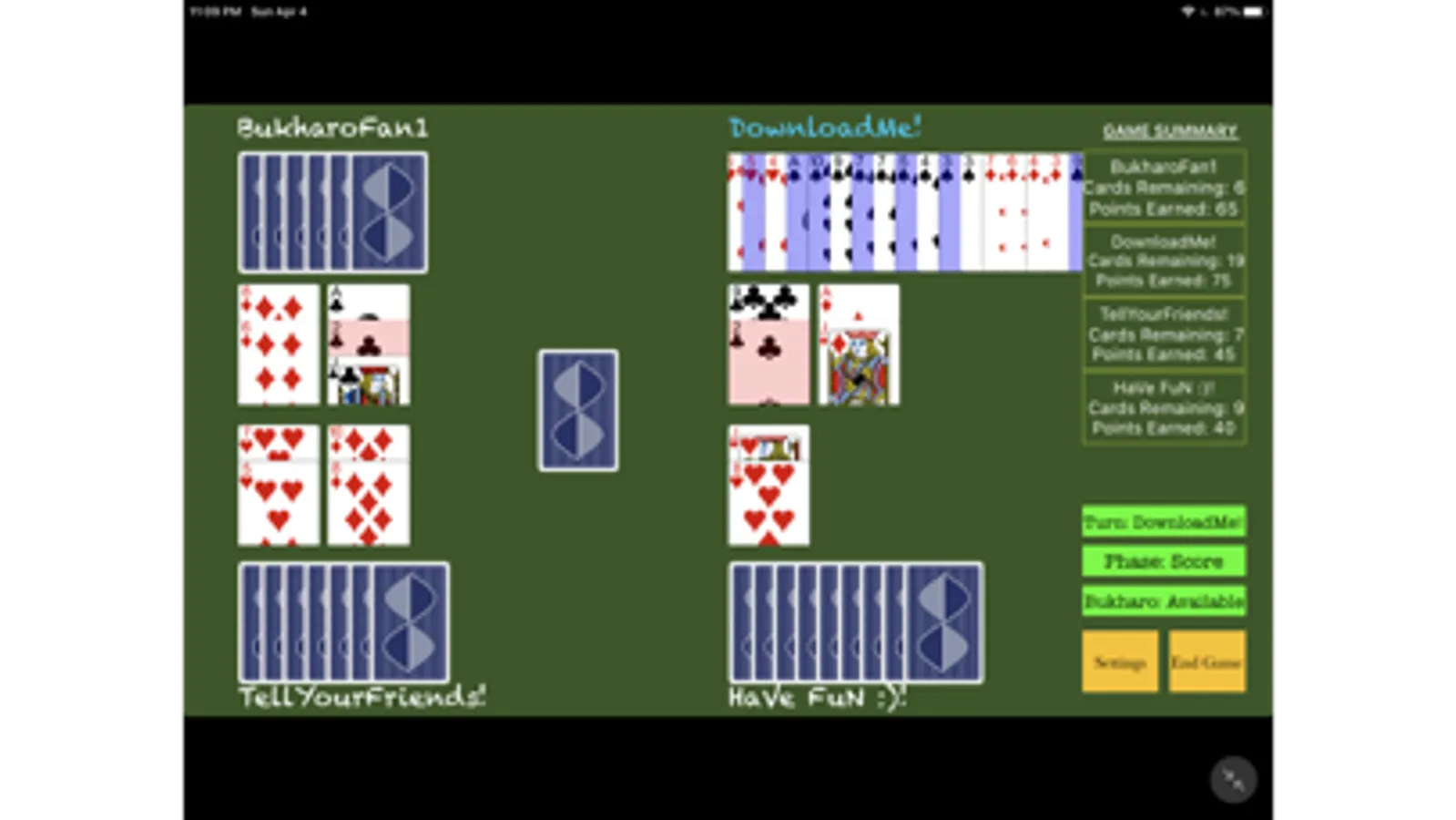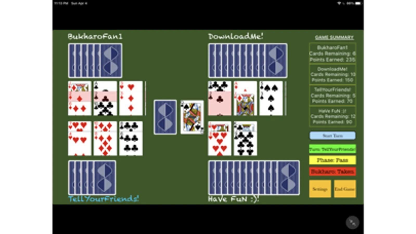 An iOS version of the popular Indian card game known as Bukharo. Designed for both new and experienced players, young and old players alike. Play with friends at home or online via our multi-player option!