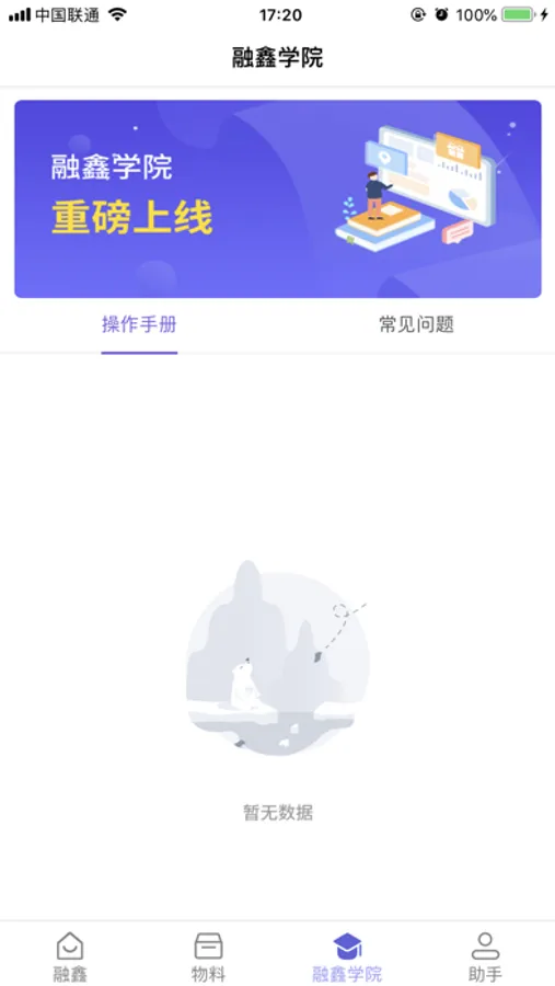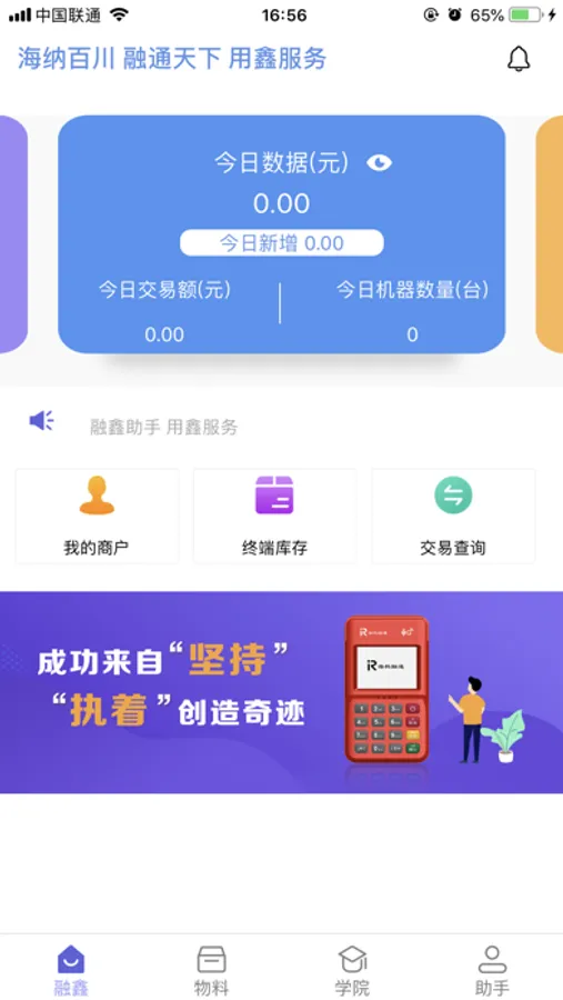 主要功能: 我的商户 终端库存 交易查询 物料 融鑫学院 我的等