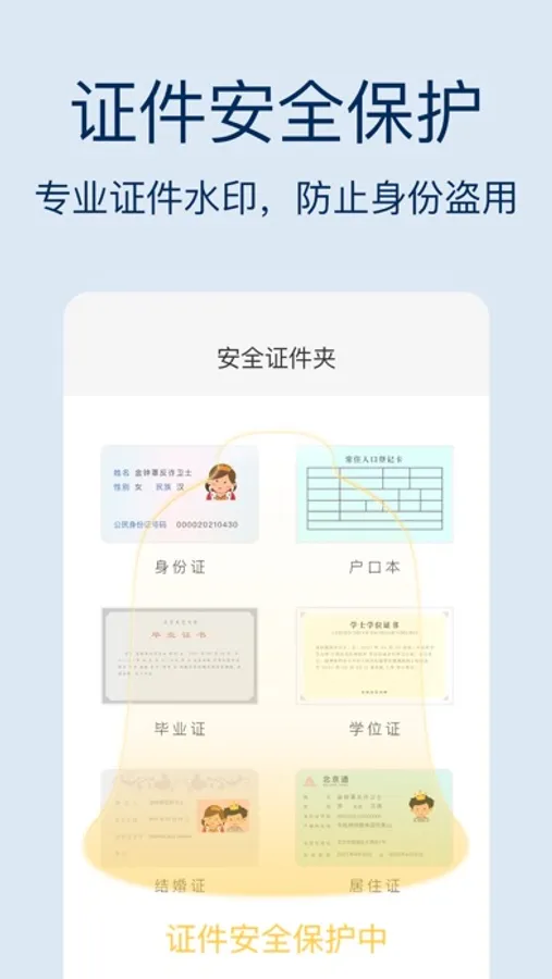 我们建议您将重要证件都通过金钟安全卫士扫描后管理,一旦遇到需要上传身份证复印件、户口本复印件等证件时,可以随时从金钟安全卫士中导出水印签注的复印件图片,再也不必回家找到证件之后再拍照那么麻烦。