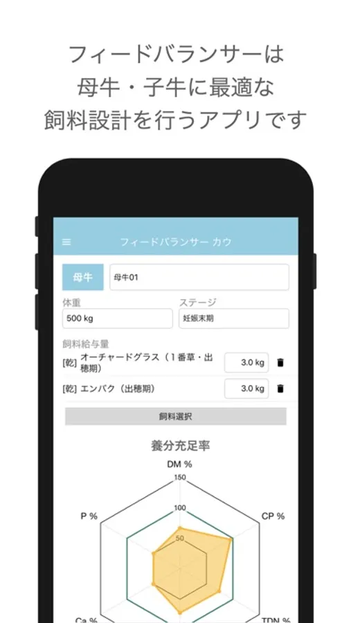 フィードバランサーは、母牛・子牛に最適な飼料設計を支援するアプリです。