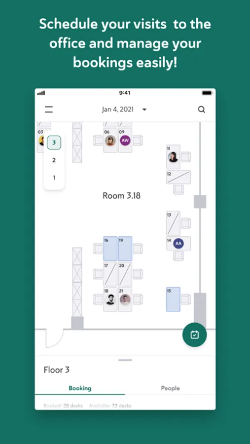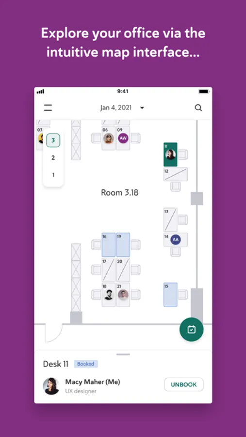 An interactive office map lets you see current and future desk availability, allowing you to reserve workspaces in your preferred areas.