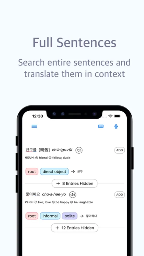 - Search for English meanings and/or Korean words using ABC
