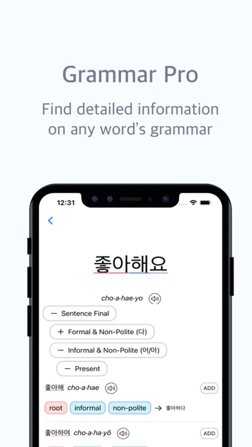 - Quiz yourself on conjugations ("past tense of 사랑해?")