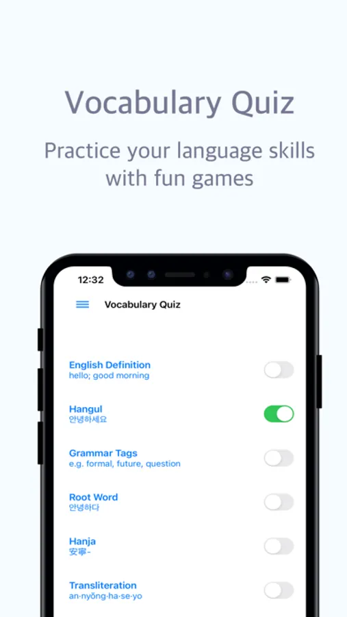 - Test in multiple directions: Hangul to English, Hanja to Hangul, Pronunciation to Hangul, or any other combination