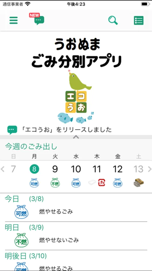 収集日変更のお知らせやイベント情報などを確認することができます。