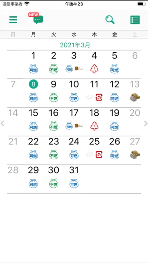 今日と明日、週ごと、月ごとの3パターンによるごみ収集日程を一つの画面ですぐに確認することができます。