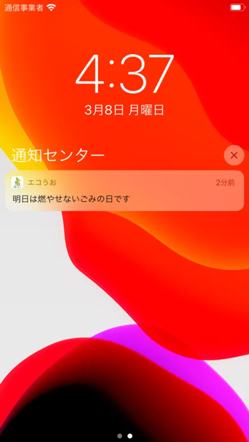収集予定のごみ種別を前日と当日にアラートでお知らせします。時間は自由に設定することができます。
