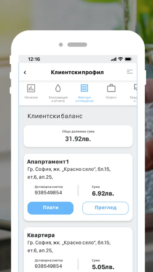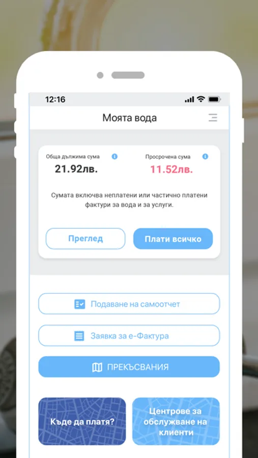 Мобилното приложение „Моята Софийска вода“ осигурява бърз, сигурен и индивидуален достъп до личния клиентски профил. През него подавате самоотчети за потребена вода, получавате навременна информация за планирани ремонтни дейности, виждате месечните си фактури за вода и ги заплащате онлайн през Вашето устройство. И още: получавате и управлявате известия, заявявате услуги, изпращате сигнали и следите графиците на проверителите на водомери във Вашите имоти.