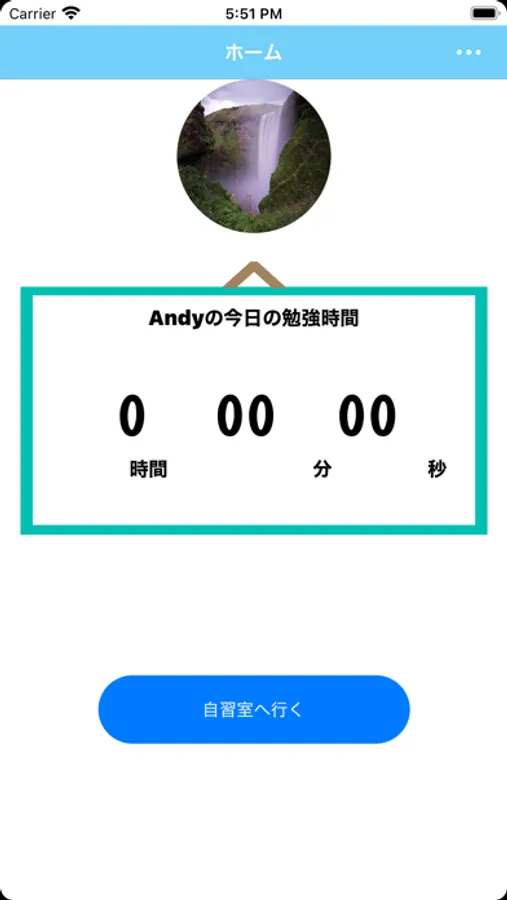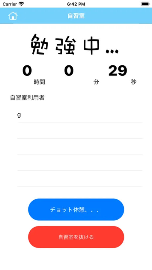 自習室へ行くボタンを押すと自習室の画面に移ります。そこでは勉強を始めると同じタイミングで勉強している他の人が表示されます。チョット休憩を押すとタイマーが止まります。もう一度押すとタイマーが動きます。自習室を抜けるか左上の家マークを押すとホーム画面に戻ります。そのときに勉強時間が記録されます。