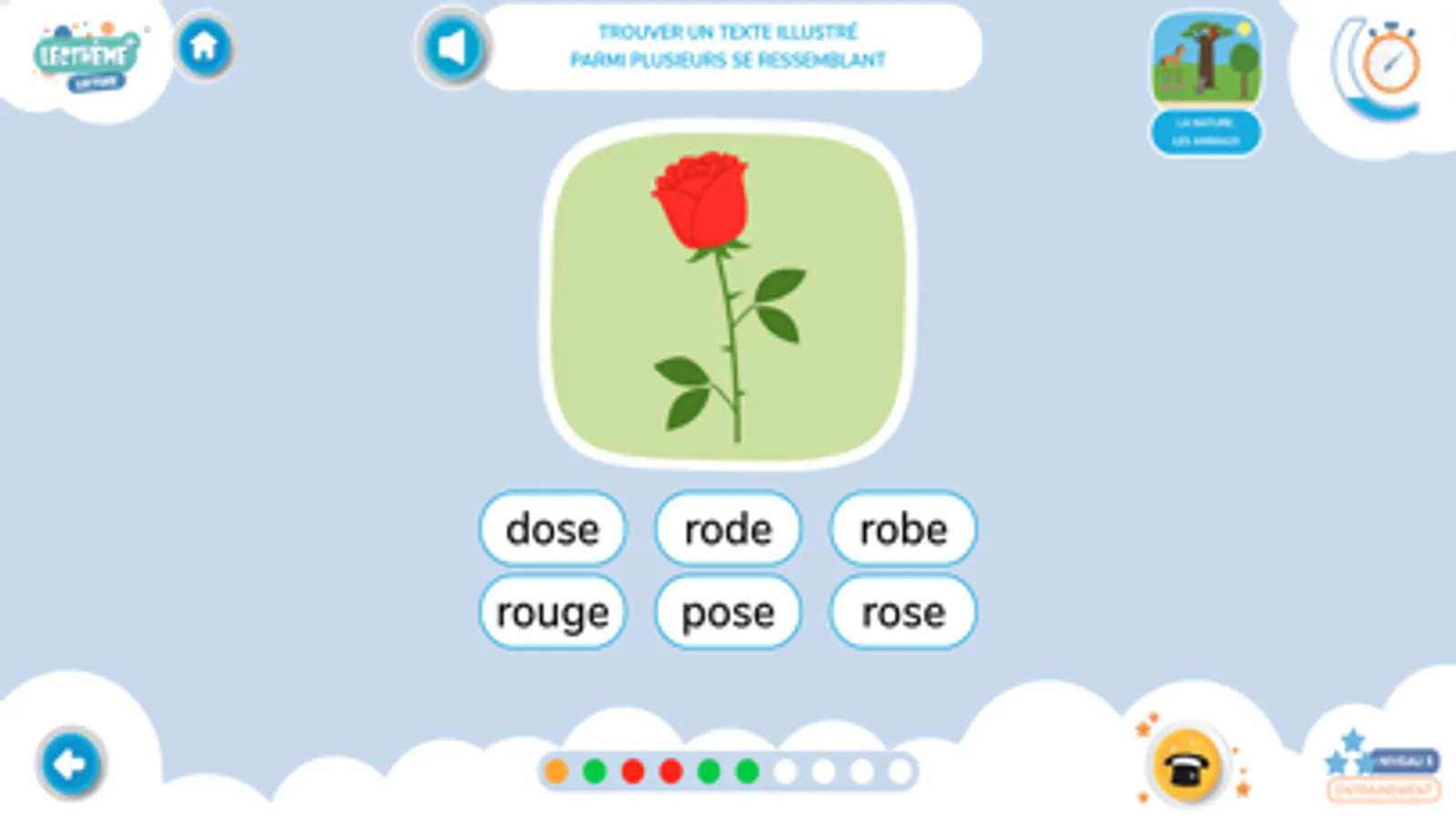 L’élève identifie le mot qui correspond au mot entendu parmi des mots ressemblant.