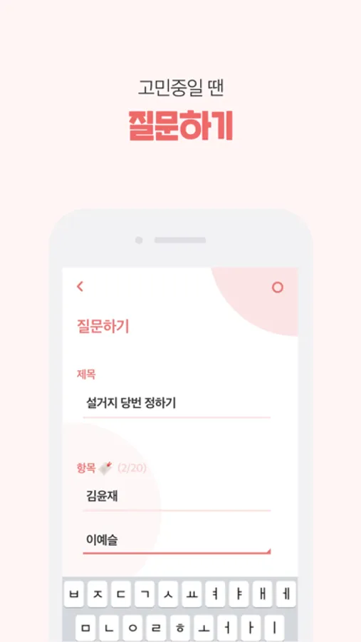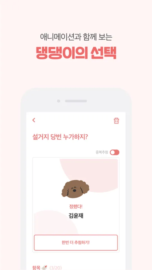 질문하기 - 당신이 커스텀한 답변 중 하나를 댕댕이가 랜덤으로 선택합니다. 식사메뉴를 정할 때, 당번을 정할 때, 무언가 할까말까 할 때 등 필요한 때 자유롭게 만들어 사용해 보세요!
