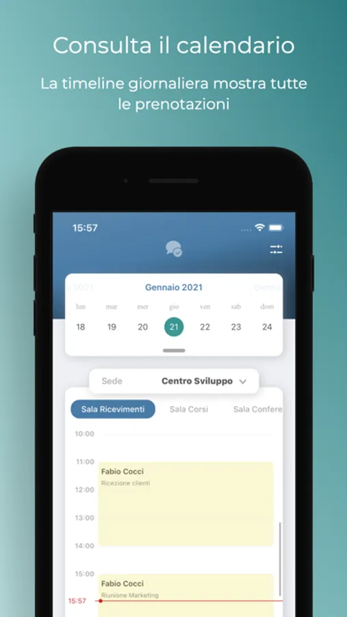 CALENDARIO: Riporta, per una determinata data, la timeline delle prenotazioni degli utenti per ogni sede e per ogni risorsa disponibile in quella determinata sede.