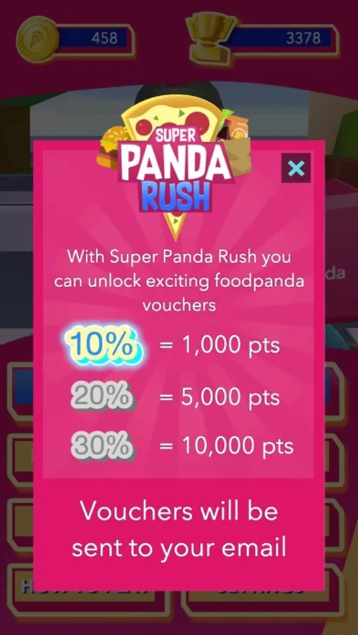 Super Panda Rush is a fun rider game by foodpanda. Jump on your motorbike, climb the leaderboard and score foodpanda vouchers, special offers and even receive event invites. How far can you make it?