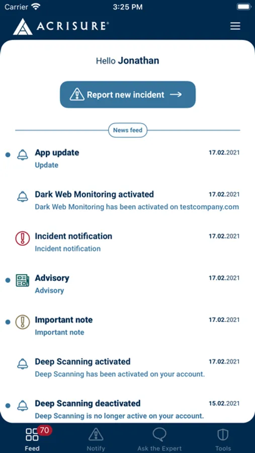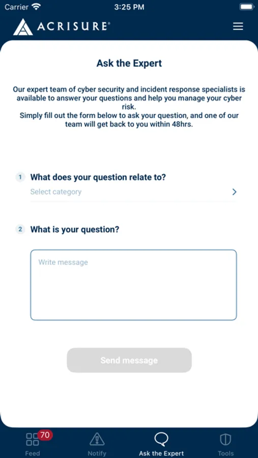 The Acrisure incident response app gives you the ability to instantly notify our incident response team of a cyber event. The app includes a tailored threat intelligence feed, direct access to our world-class cyber incident response team via the 'Ask the expert' functionality, and a number of tools to help you protect your business against cyber attacks.