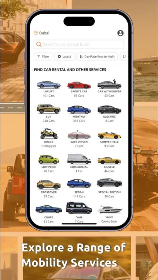 With 2000+ rental cars and hundreds of offers in 20+ cities, our car rental partner’s fleet includes every car you've ever dreamed of. From high-end supercar rentals in Dubai such as Ferrari, Lamborghini, and Rolls Royce, to luxury SUVs like Range Rover, Mercedes Benz, and even economy cars such as Kia Picanto, Nissan Sunny, and Renault Duster.