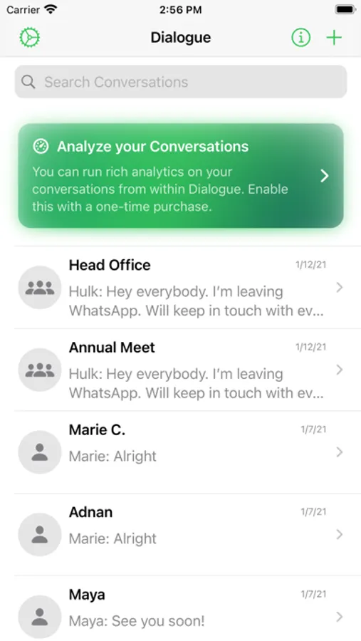 With Dialogue Analyze, you can analyze your chats and conversations with rich charts, graphs, and summaries. You get never-before-seen insights into your WhatsApp chats.