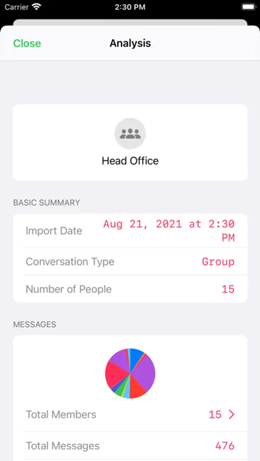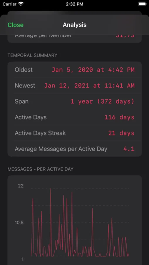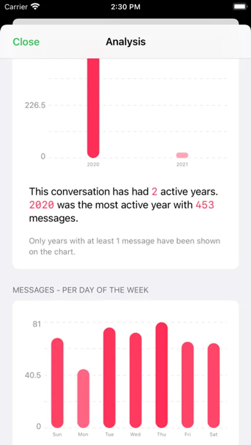 Everything stays on your device, and the analysis is quick even for conversations with tens of thousand messages.