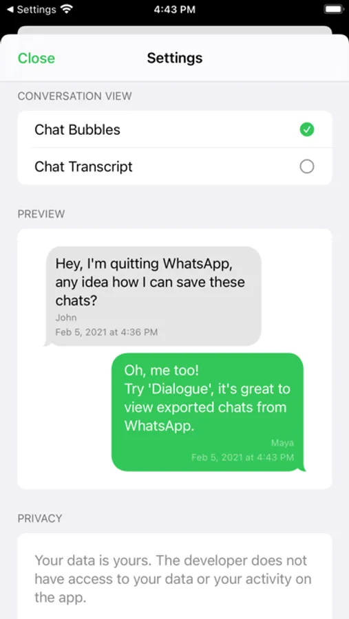 Dialogue is a simple app that lets you store and browse your exported conversations from other chat apps like WhatsApp for posterity.