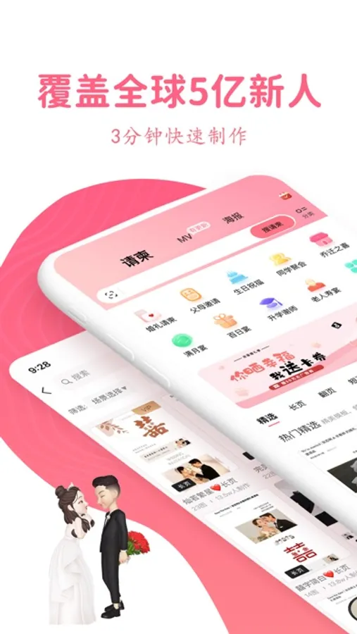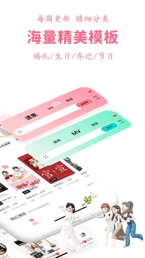 婚礼、生日派对、宝宝满月、宝宝百日宴、同学会、毕业升学宴、谢师宴、生日宴、老人寿宴、乔迁、婚礼纪念等海量精美电子请帖/电子相册视频模板。